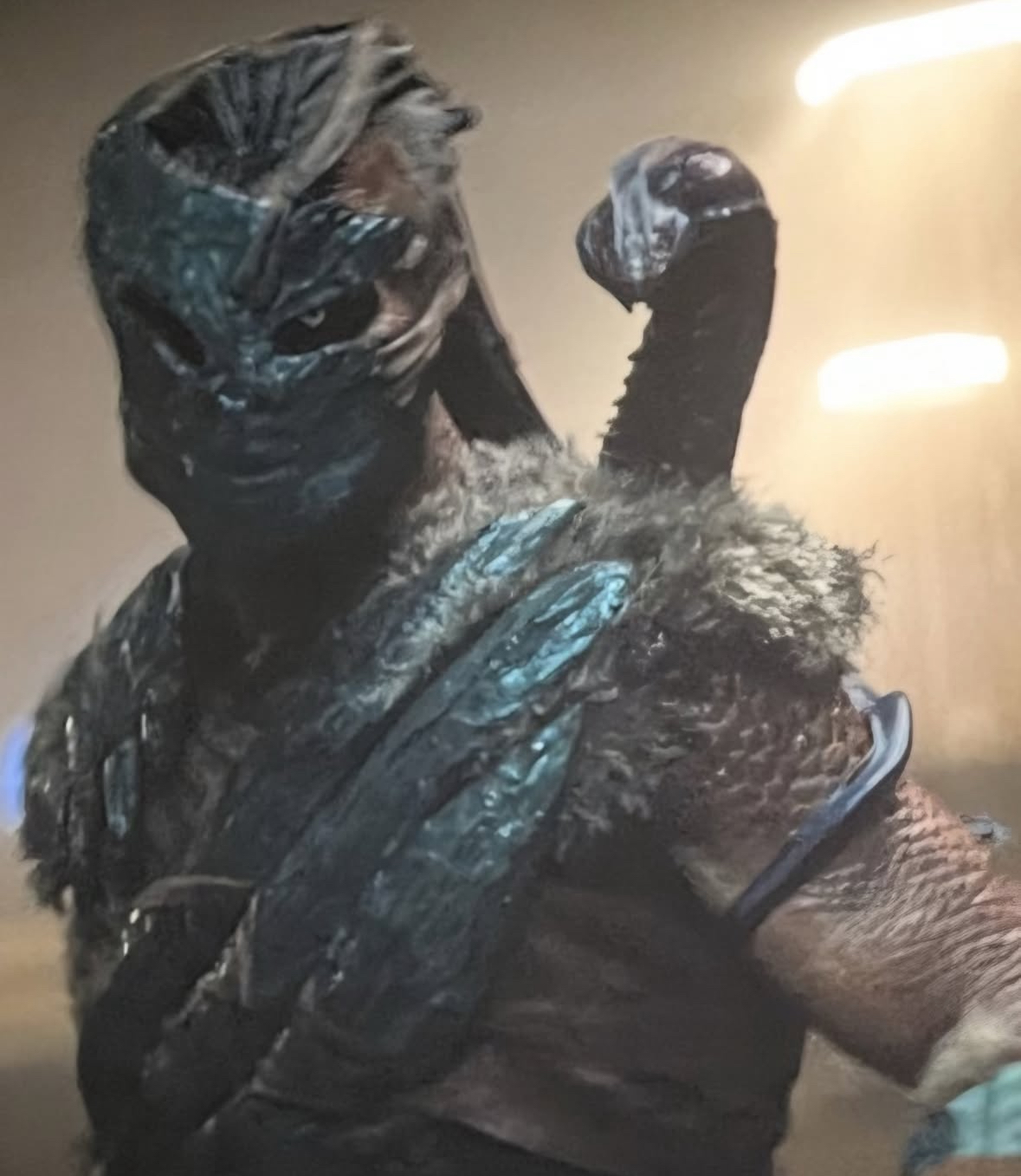 A closer look at Dek and his organic makeshift armour in Badlands showing his alien Eel-companion nicknamed Squirt and his Bone Bison mask.
